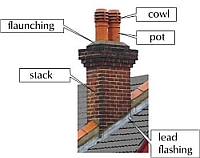 Chimney pots are held in place by a great glob of cement-rich mortar, the flaunching, which also acts as the weathering for the top of the stack.