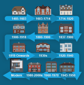 Some houses have a recognisable style; they have clear Georgian, Gothic or Arts and Crafts features, for example. These will give you broad date ranges. But many buildings, particularly more modest houses, have an eclectic mix of features. These are dateable by looking at individual elements. For example, red brick frontages began to appear in the 1880s, becoming common to most standards of house only in the 1890s.
